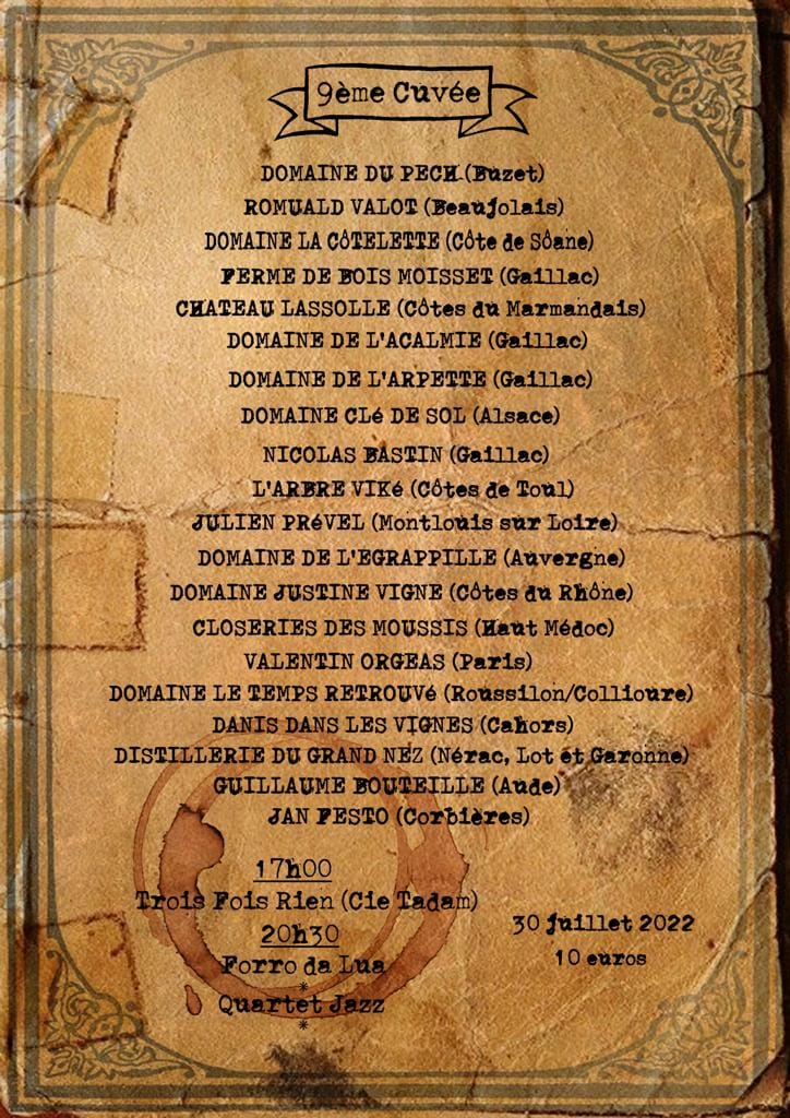Et maintenant… RDV samedi 30 juillet à la ferme de Cauberotte/Laverny à Moncrabeau pour les Petites Rencontres des Vins Vivants !!! Entrée à partir de 14h, spectacle à 17h, et concerts à partir de 20h30 ! Encore un superbe lieu pour accueillir Trois Fois Rien, la régalade !!!