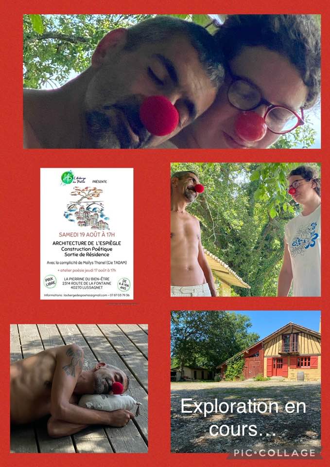 Après la citadine Muret, c’est à la bucolique Pierrine du Bien-être que TADAM! a posé ses valises pour 3 jours auprès de L’Auberge des Poètes et, de nouveau, offrir son regard extérieur : Emmanuelle et Clément sont dompteurs de mots agiles en quête de clown pour rafraîchir leur spectacle « Architecture de l’Espiègle ». Avant un riche travail de recherche des personnages, cet accompagnement a d’abord pris une autre couleur : celle d’une formation, pour aller de l’écoute de soi à l’expression de ce Soi amplifié qui se meut à travers le clown. Le talent du verbe a laissé place aux fragiles ouvertures à l’espace intime, alors offert avec courage et tendresse. Quel bonheur de les voir aujourd’hui dire y avoir trouvé « un brin de folie et notre enfance intérieure et rieuse ». Merci à eux pour leur confiance ! Que ces enfants intérieurs n’en finissent plus de dire, et de rire !